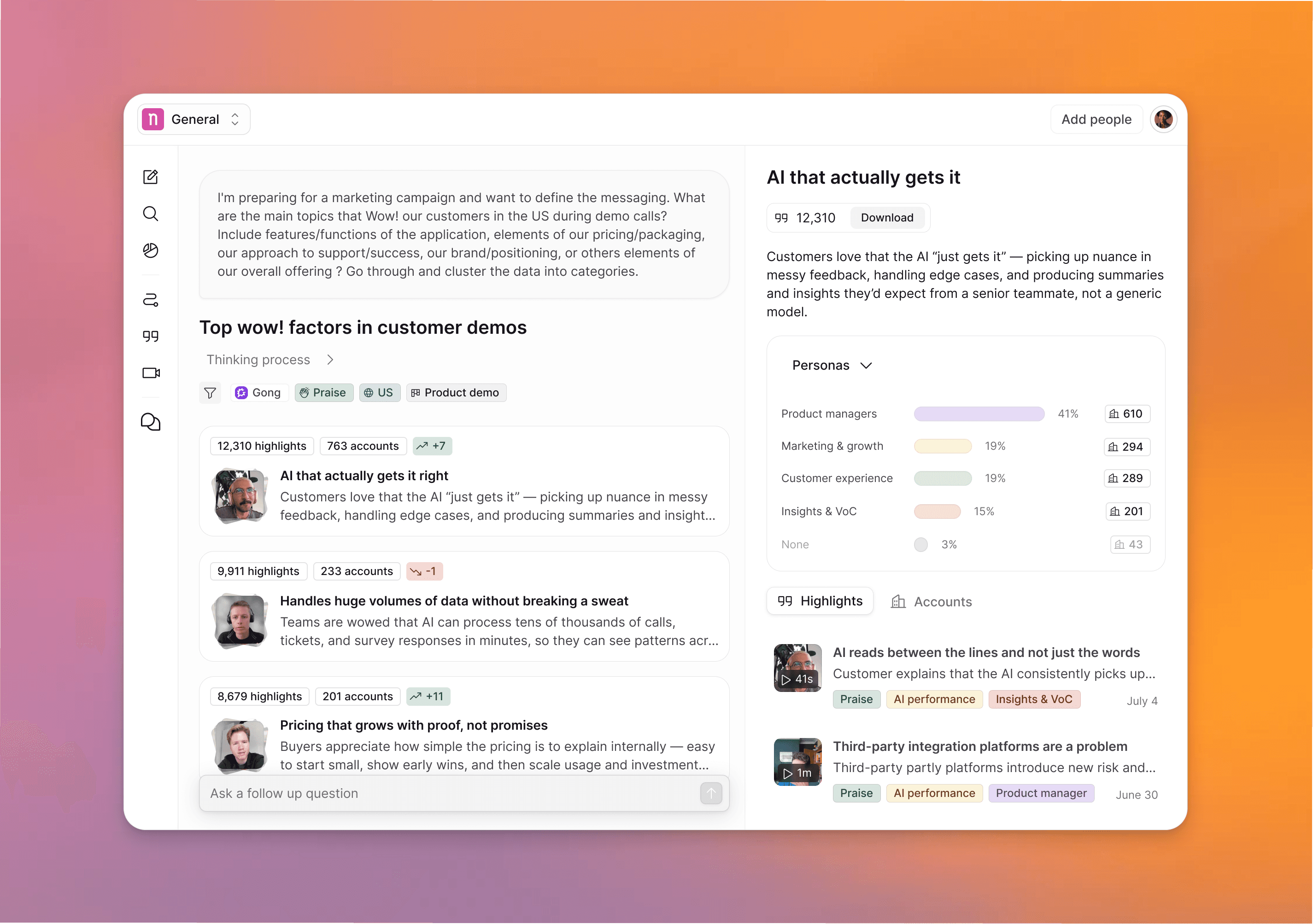 Ask anything and get purpose-designed answers that validate your ideas, compare datasets, and go deep into research.