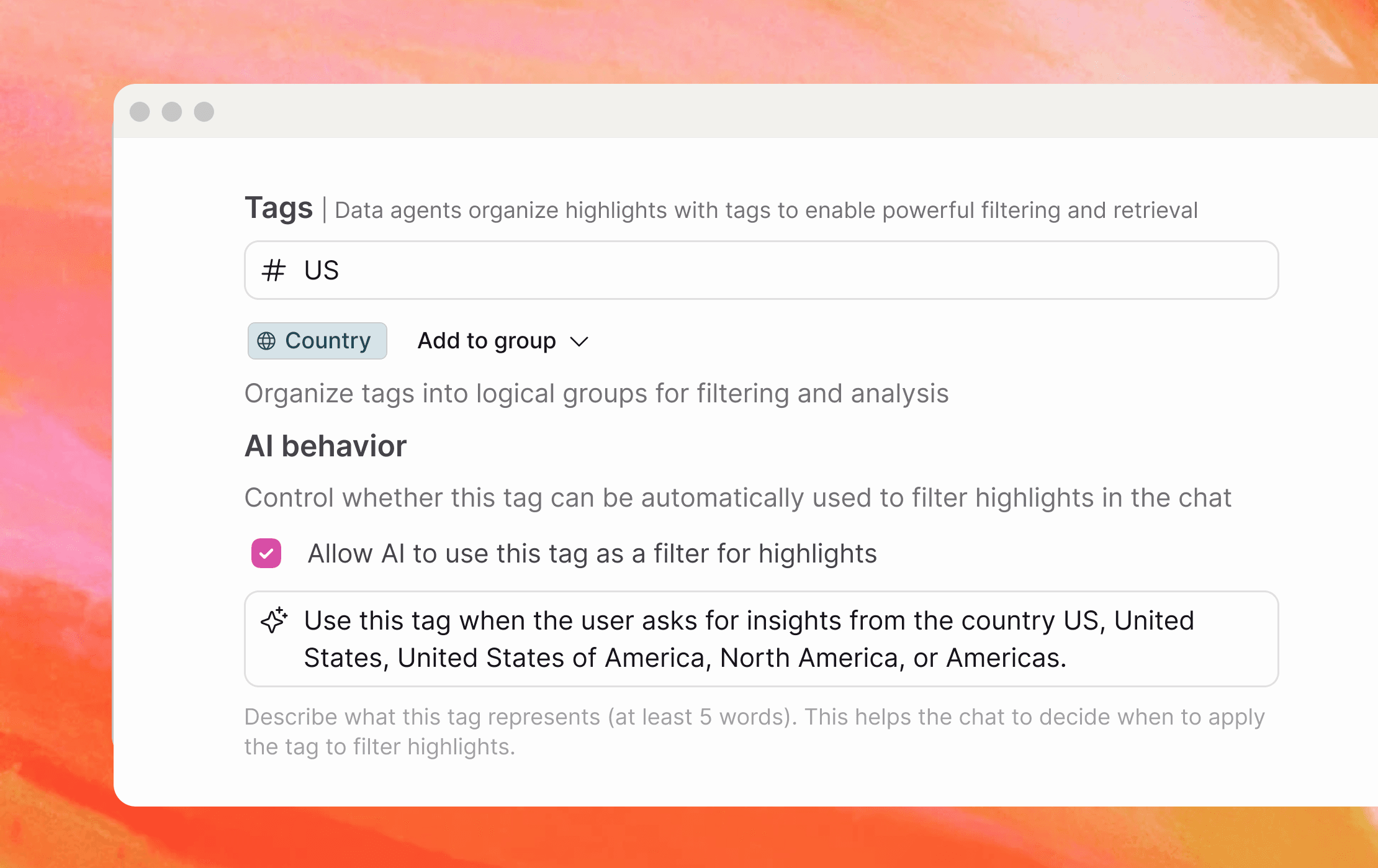 Teams rely on Tags to narrow data and their focus in chat. To help our stack perform, tags now get an AI-generated description by default, with a clear opt-out if you prefer to manage descriptions yourself. This improves tag quality from day one and makes Focus behavior in chat more reliable. A backfill tool can generate missing descriptions for existing Tags.