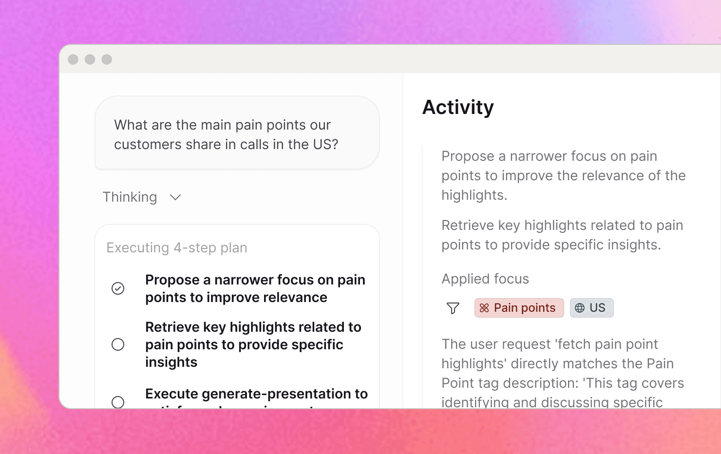 It used to be hard to tell where chat was in its thinking — especially when the plan shifted partway through. The planning phase and execution steps are now shown separately and in order, so you can see exactly what chat decided to do and how it's progressing. Status updates are more accurate, and pauses for your input happen more reliably.