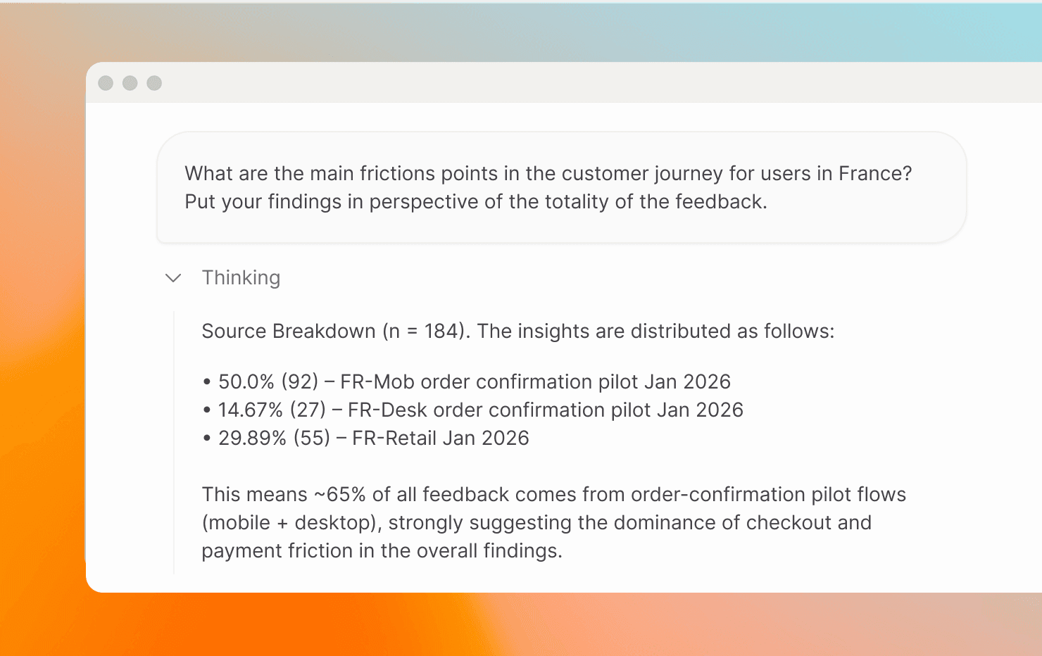 Chat answers can feel overly definitive — meaning the answer can read like a general truth about the whole dataset — even when it’s actually based on a smaller set of data. Chat now has structured awareness of the size and composition of the dataset in Focus, so it can frame Clusters and insights relative to the broader dataset. This helps teams judge signal strength, reduces over-interpretation of small samples, and makes analysis more transparent.
