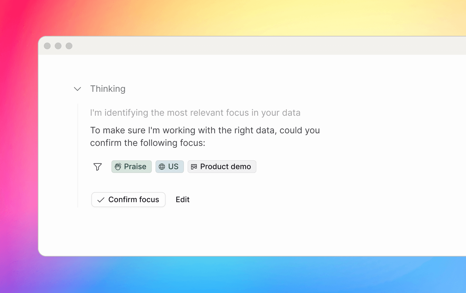 We improved how chat decides what data to focus on for agentic tasks. Previously, it would auto-narrow the scope, which worked most of the time but sometimes picked the wrong focus. Now, when you prompt, chat proposes a focus (topic, product area, date/range, segment, etc.) and pauses so you can confirm or adjust before it runs. Chat then resumes from that point—so results are more accurate, the scope is explicit, and there’s less guesswork.