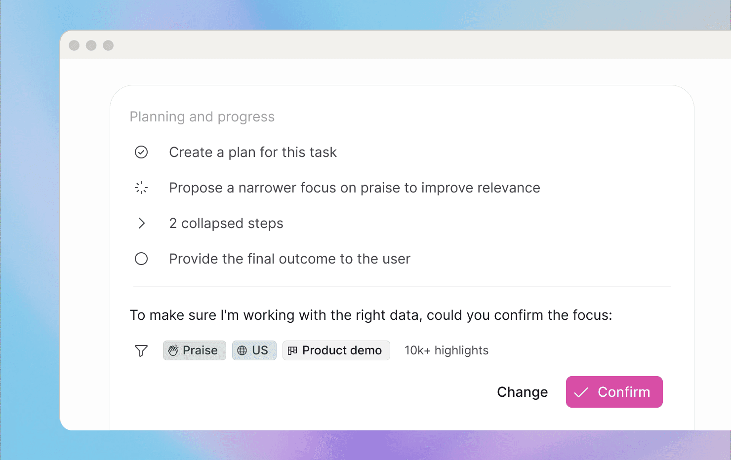 When you ask a question in chat, the agent builds a plan before it executes — and that plan now shows the full picture. The applied Focus appears directly beneath each step, and confirmations that used to live in a separate area are now inline with clear titles and status icons. You can follow the agent's reasoning top to bottom — what data it's working with, what it decided to do, and where things stand — in a single view.