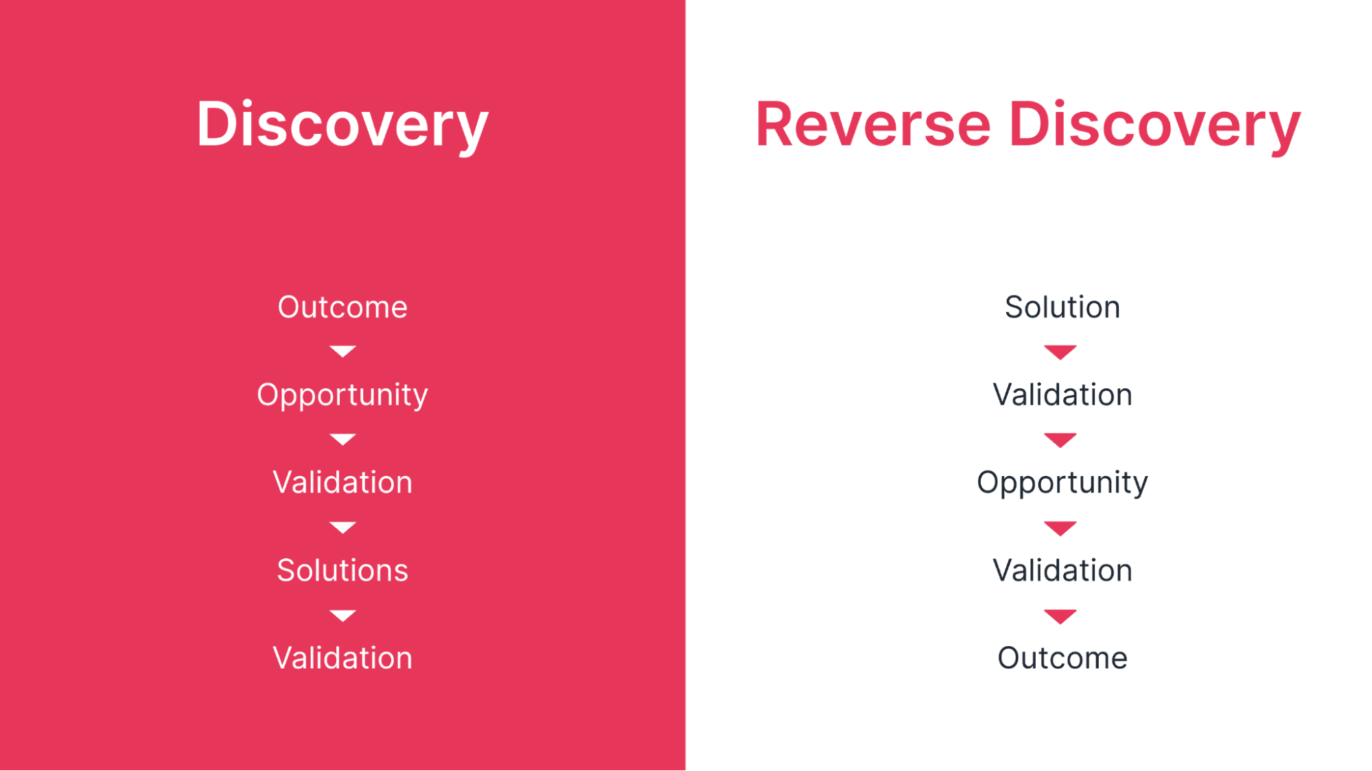 Reverse-discovery is a process developed by our very own CPO Marcel Hagedoorn. The idea is to essentially start with products or features (i.e. solutions) you already have on your roadmap and reverse-engineer the discovery process from there.