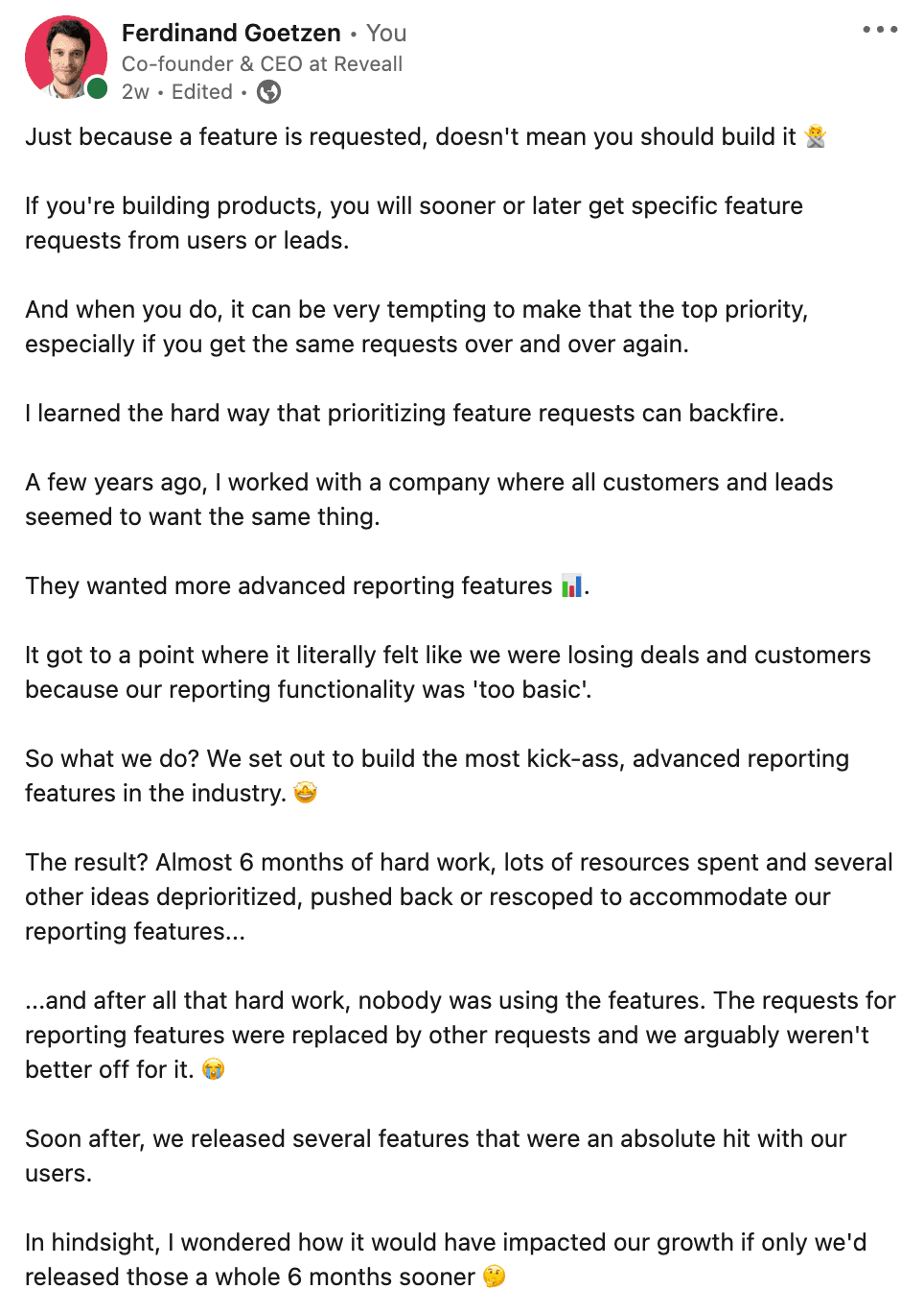 At the end of the day, building and shipping a feature or product is the most expensive way of validating an idea. Investing more time into doing product discovery well can significantly reduce the risk of building features that fail. And to do product discovery well, teams need to think in terms of outcomes (What change in customer behaviour do we want to see? What goals are we trying to reach?) rather than outputs (let’s ship feature X, product Y).