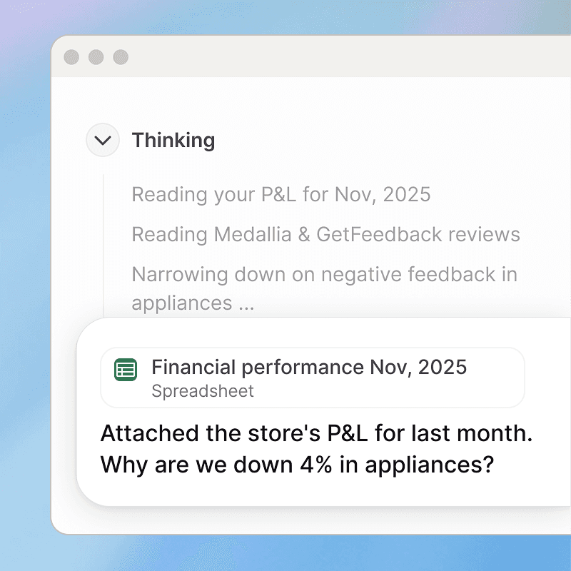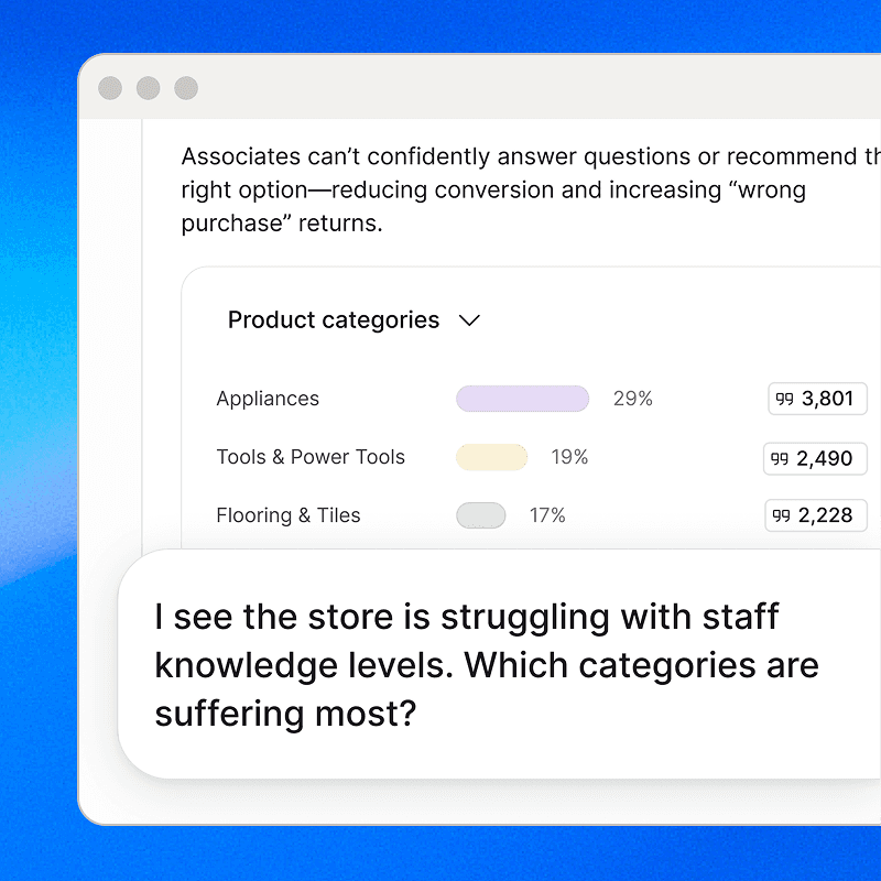 Agents cluster themes, quantify drivers, & surface evidence with counts & quotes—across stores, regions, segments.