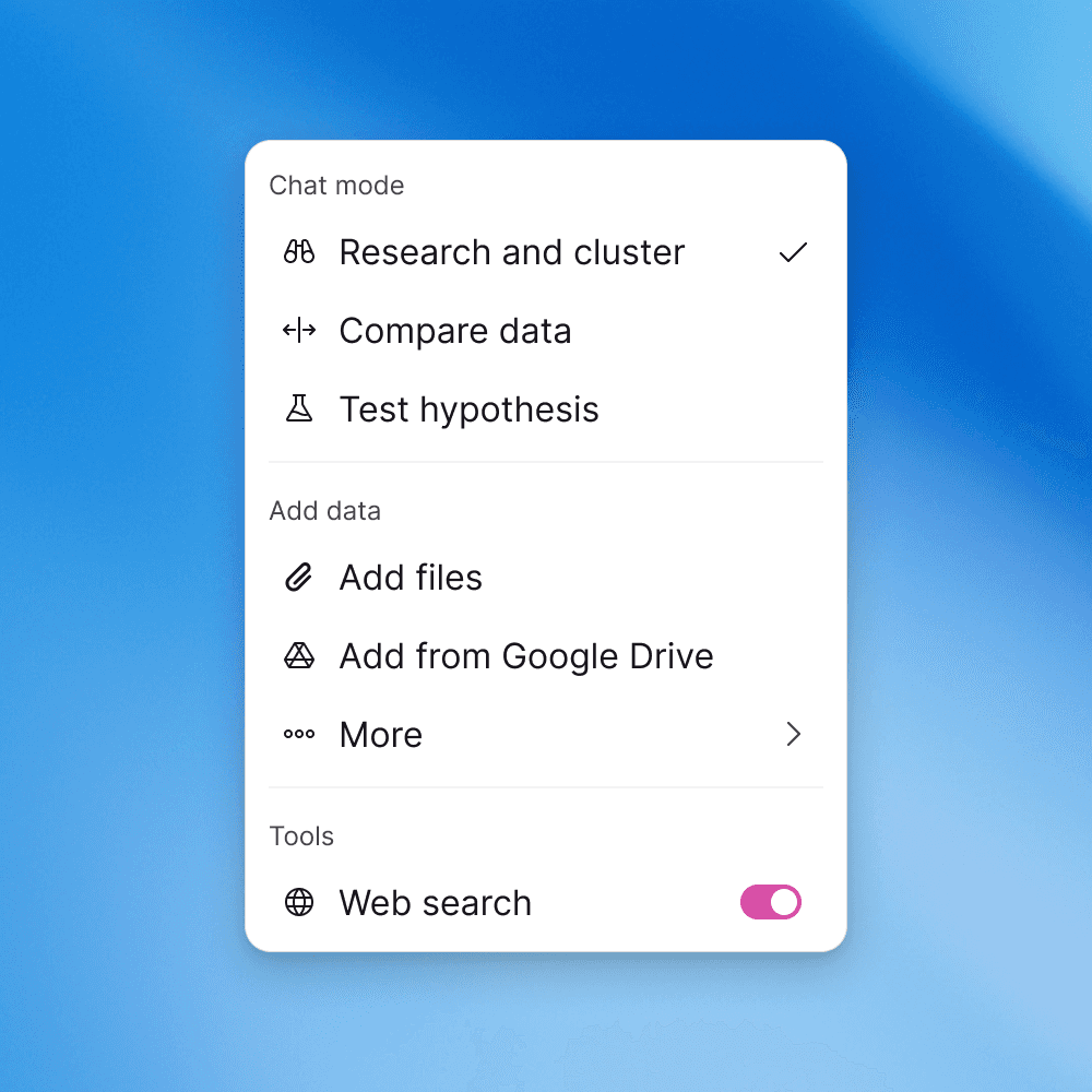 Previously, chat could implicitly have access to all available sources (surveys, G Drive, Confluence, etc.). Now, the AI is limited to the inputs you explicitly opt into for that chat. This makes it much clearer where answers are coming from, improves trust, and better aligns with enterprise expectations around data access and privacy. Conversations become more predictable, more explainable, and easier to reason about—with no hidden data pulled in behind the scenes.