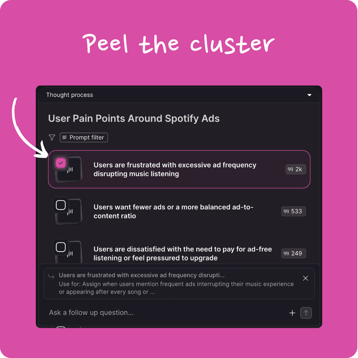 Clusters in Labs are no longer a dead end. You can now ask follow-up questions on one or more clusters and even generate sub-clusters to dig deeper, all while staying in the same context. This makes it easier to move from a high-level overview to detailed insights in a single flow.